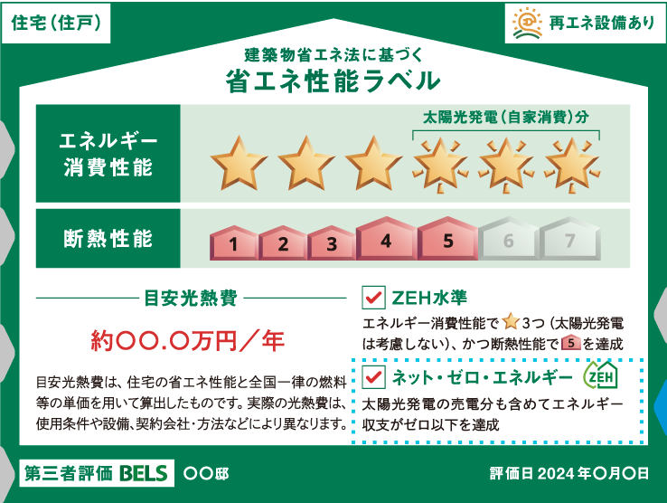 • 第三者評価BELS(ベルス):第三者機関が、その住宅のエネルギー消費性能や断熱性能を評価・表示する制度であり、第三者機関の審査を受けた後に評価書等が交付されます。第三者評価BELSではなく、売主・貸主の会社による自己評価の場合もあります。