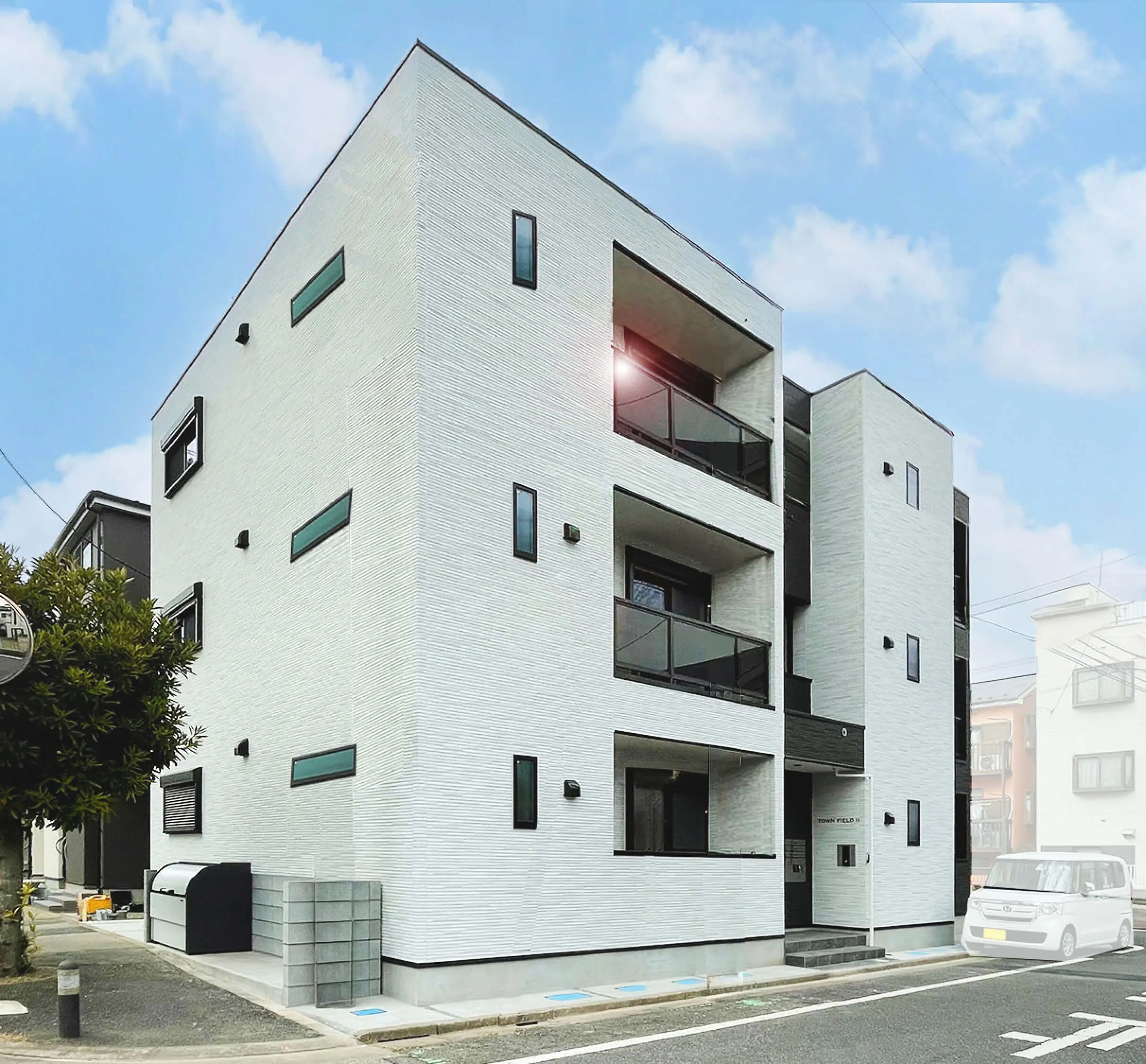 区画整理地にひと際映えるレンガ模様の集合住宅